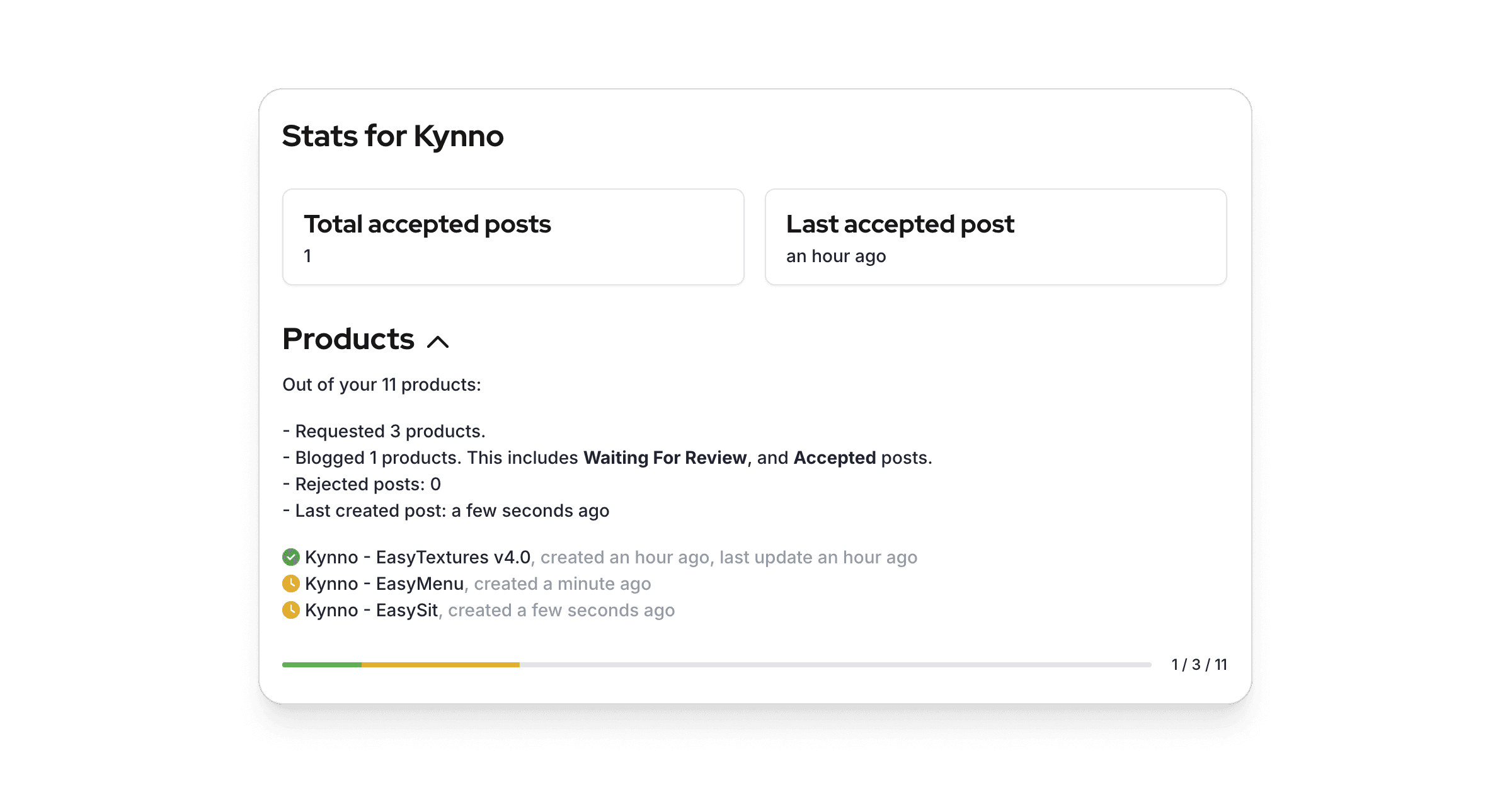 If you are a creator or manager, of a store or event, you will be able to see the summary of products by a blogger, what product they successfully blogged (with an accepted post), what product is still in progress, etc.